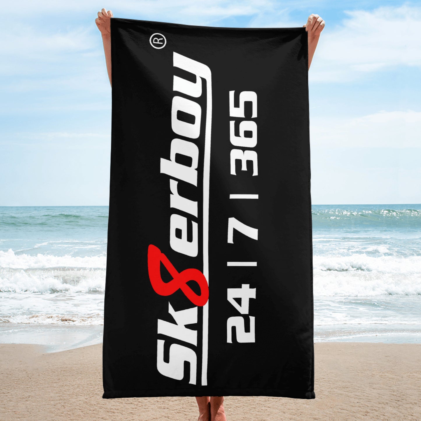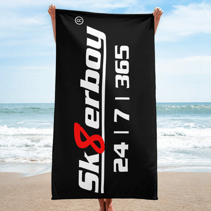 Das Sk8erboy® Logo mit unserem 24 | 7 | 365 Slogan ist in weiß mit roter Acht auf schwarzem Untergrund gedruckt. Das Badetuch ist ca. 76 x 152 cm groß.