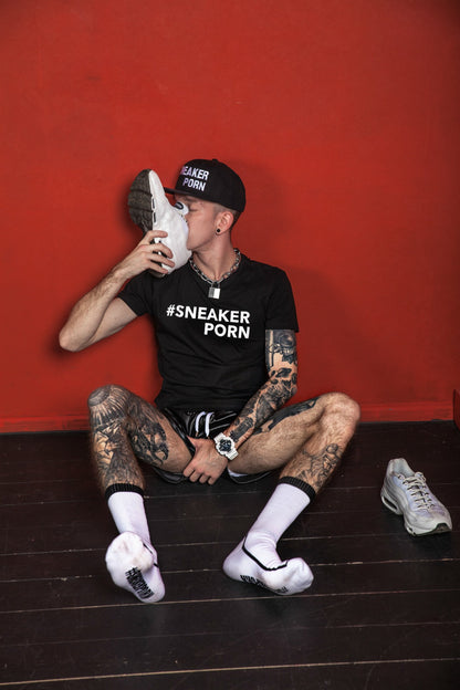 In the classic white and black, these socks go with all your clothes and sneakers. Whether a chilled evening with friends or the next gay party. The present message #SNEAKERPORN shows the boys what's going on. You are clearly into fat sneakers and are absolutely trendy. This is a clear indication of the hot topics you follow on social media such as Instagram and Facebook. Clearly, right on trend!