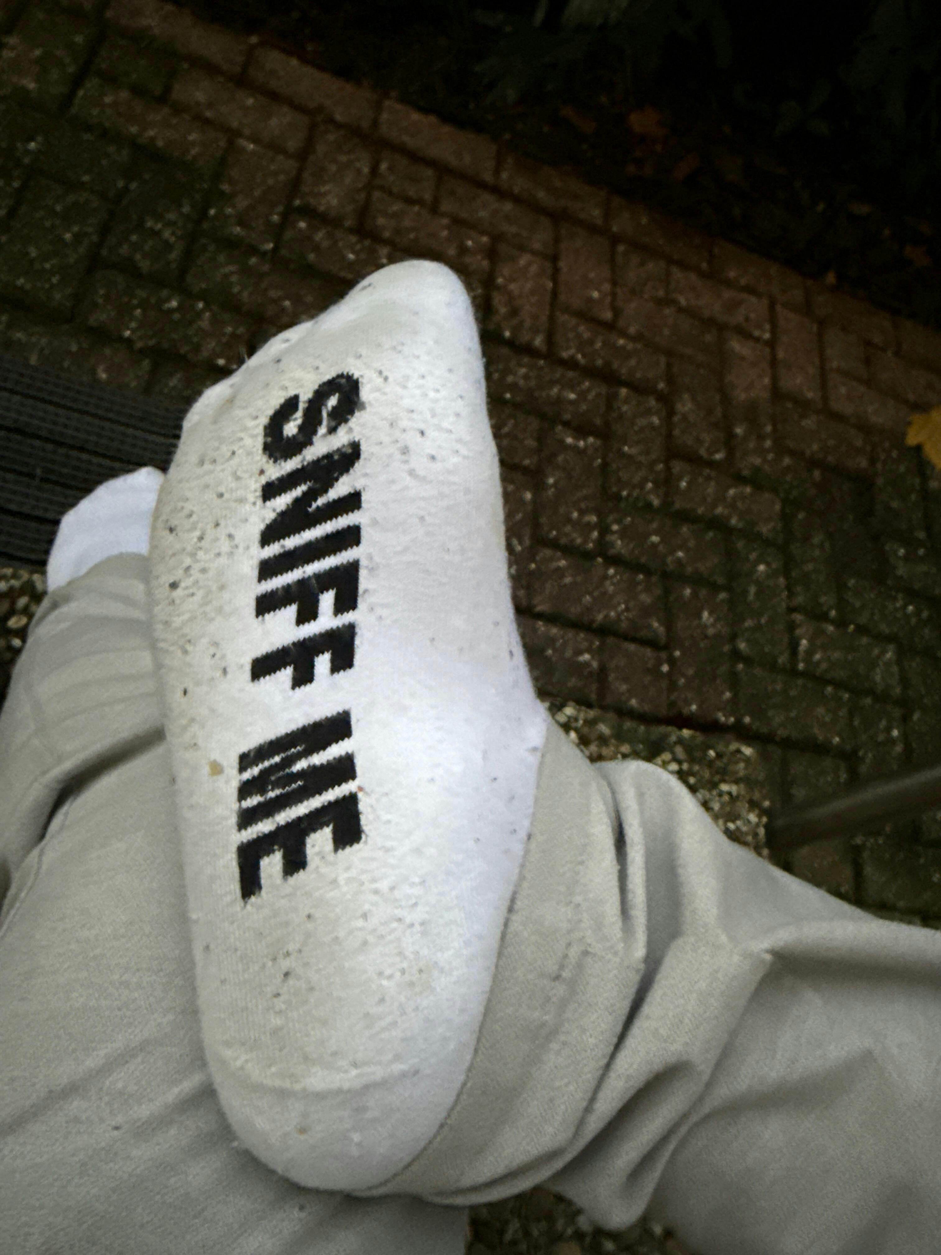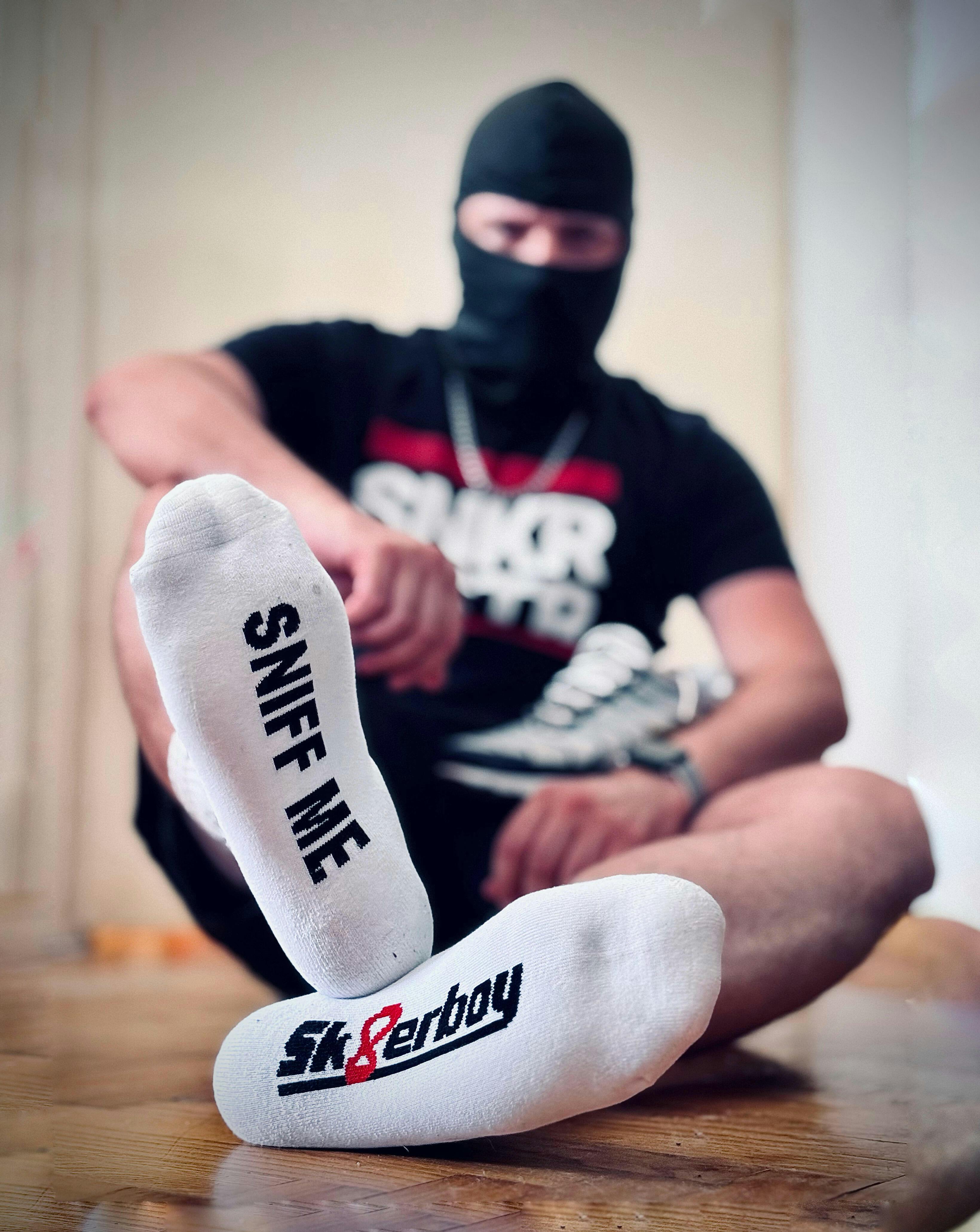 Yeah Andre! Weiße SNIFF ME Socks – sehen clean aus, aber je länger du sie trägst, desto dreckiger & geiler werden sie 😈. Perfekt zum Sniffen!